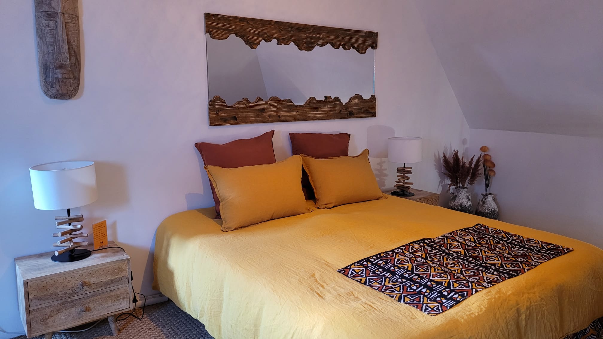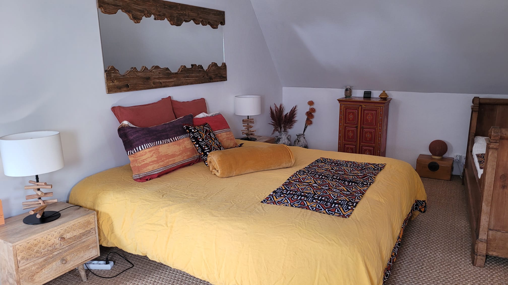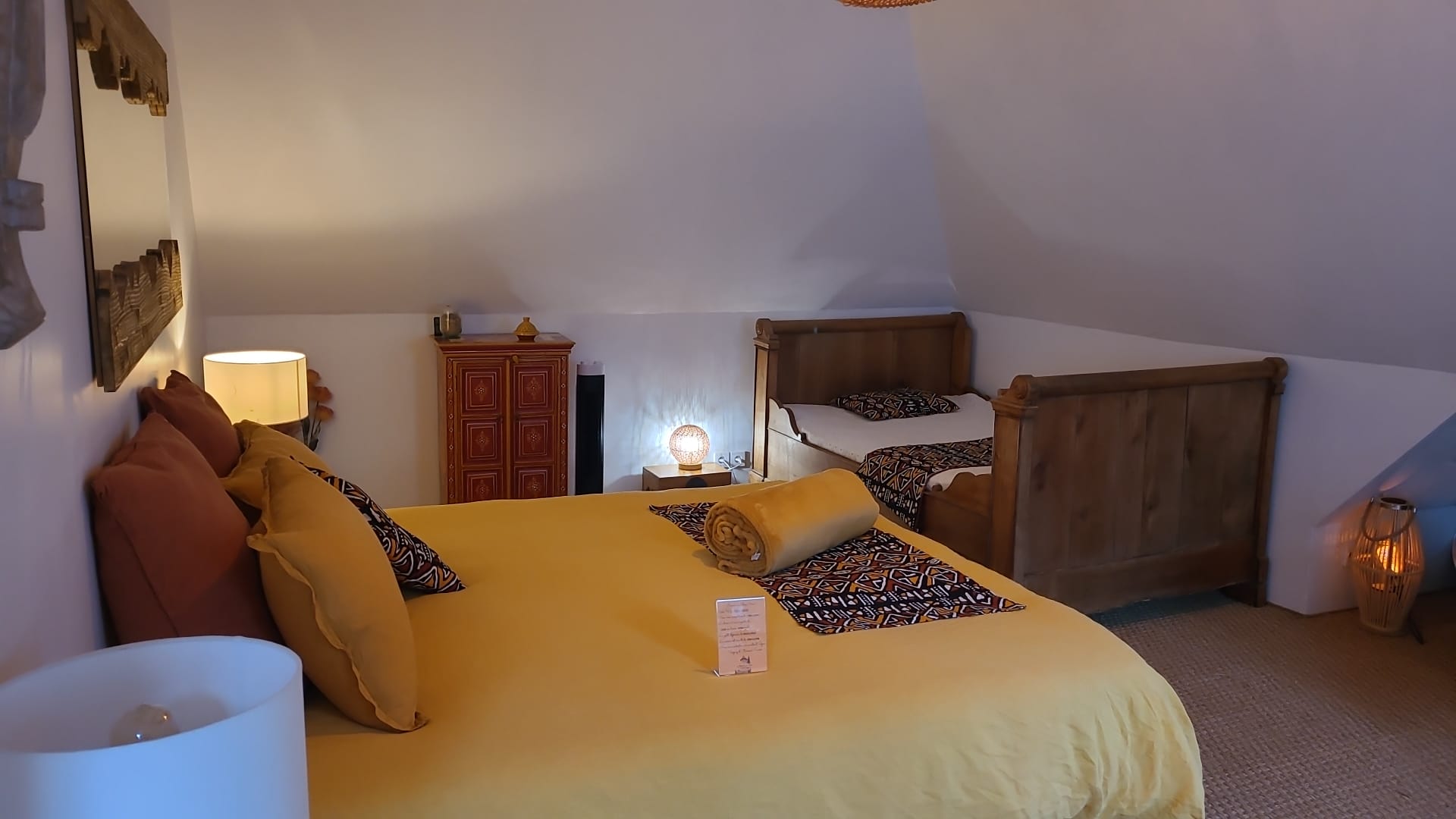 Nichée sous les toits, cette grande suite familiale aux tons épicés, est composée de deux chambres.